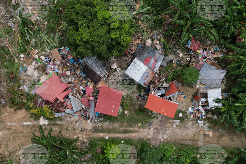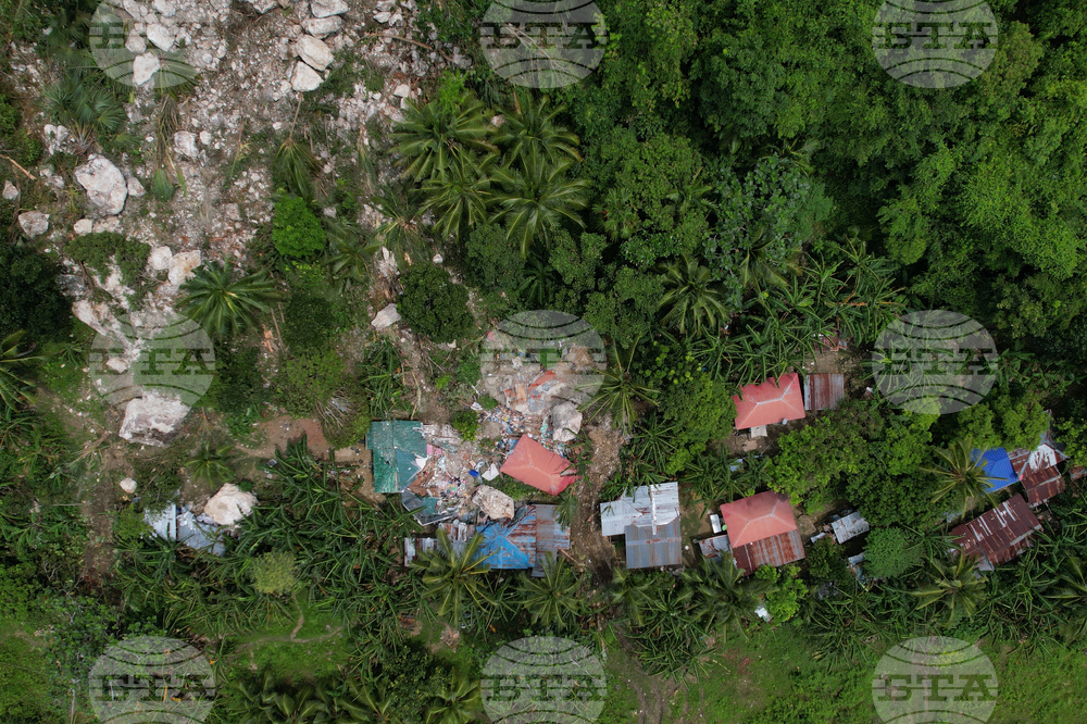 Damaged homes lie after a landslide caused by Tuesday's strong earthquake killed some people sleeping in their hillside homes, Thursday, Oct. 2, 2025, in Bogo city, Cebu Province, Central Philippines. (AP Photo/Aaron Favila)
