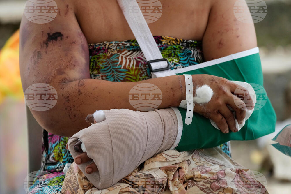 A resident gestures as he shows his injury outside his damaged home on Thursday, Oct. 2, 2025 after Tuesday's strong earthquake in Medellin city, Cebu Province, Central Philippines. (AP Photo/Aaron Favila)