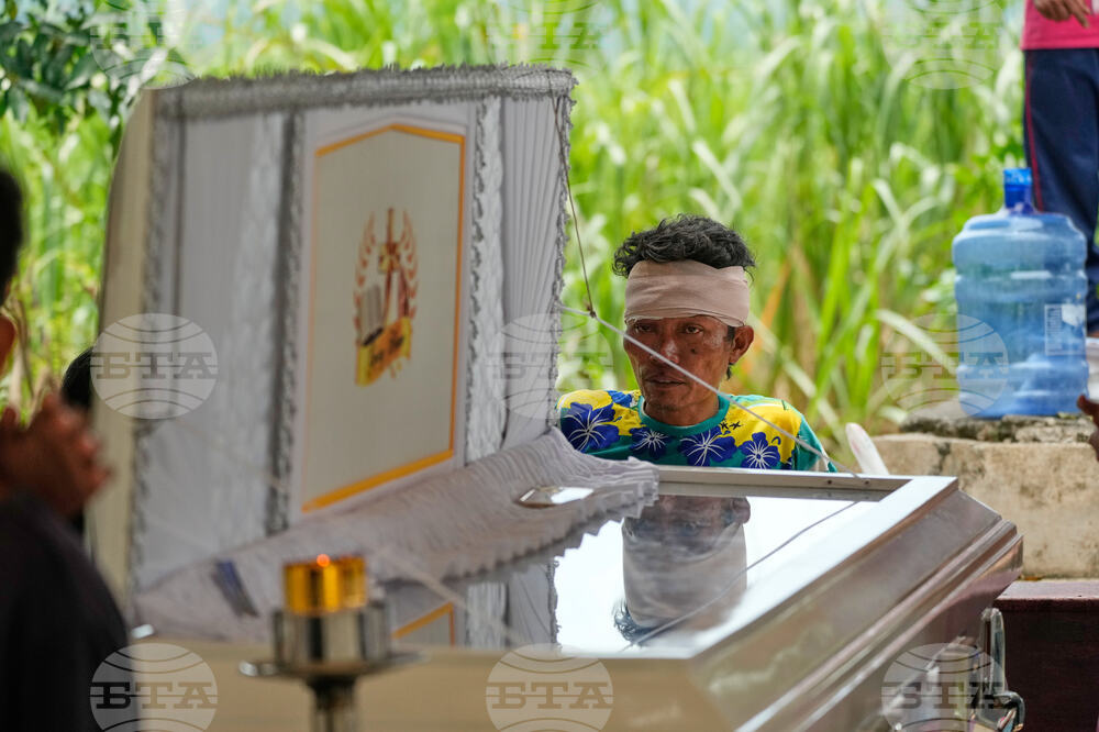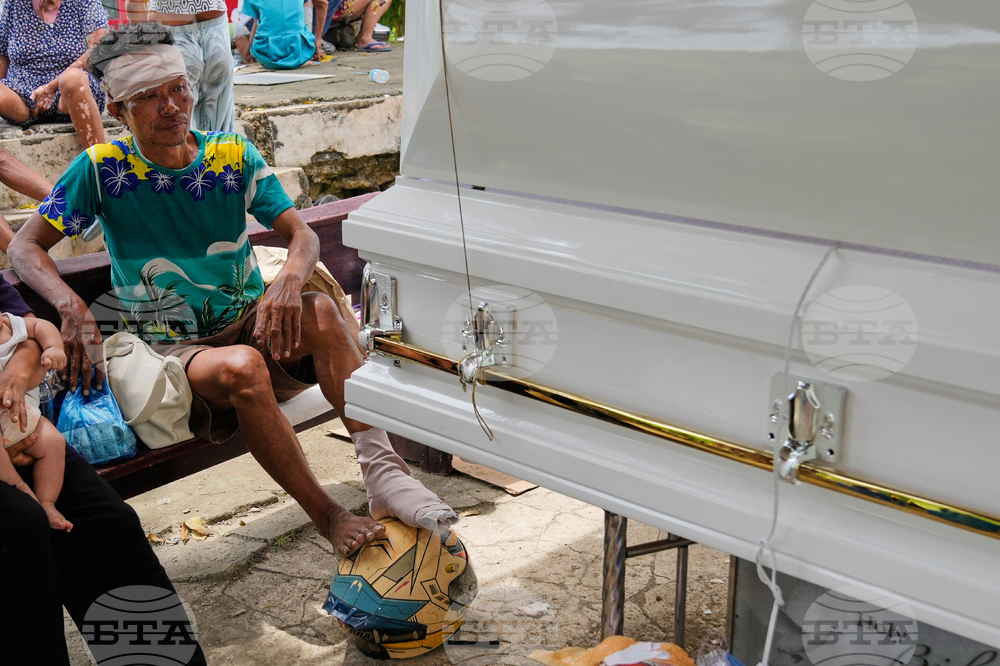 Survivor Silvestre Ytang Jr. sits beside the coffin of his daughter on Thursday, Oct. 2, 2025, some days after a strong earthquake struck causing a landslide that crashed their hillside homes in Bogo city, Cebu Province, Central Philippines. (AP Photo/Aaron Favila)