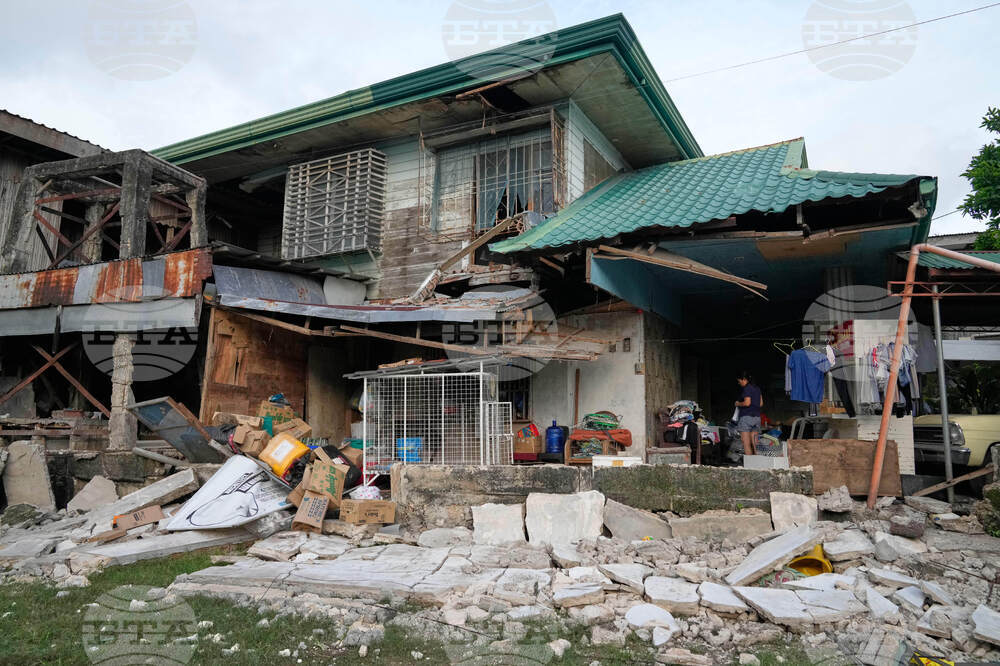 A resident sits outside a damaged home on Thursday, Oct. 2, 2025 after Tuesday' strong earthquake in Medellin city, Cebu Province, Central Philippines. (AP Photo/Aaron Favila)
