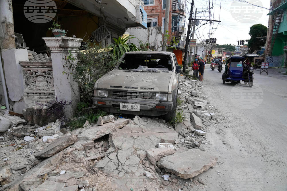 Debris surround a damaged car caused by a recent strong earthquake in Bogo city, Cebu Province, Central Philippines on Thursday, Oct. 2, 2025. (AP Photo/Aaron Favila)