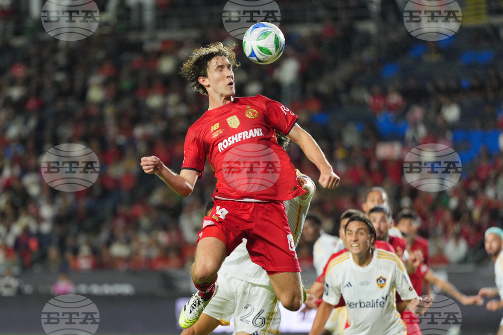 Corrects name to Marcel Ruiz not Nicolas Castro - Toluca's Marcel Ruiz leaps to head the ball during the first half of a Campeones Cup soccer match against the Los Angeles Galaxy Wednesday, Oct. 1, 2025, in Carson, Calif. (AP Photo/Jae C. Hong)