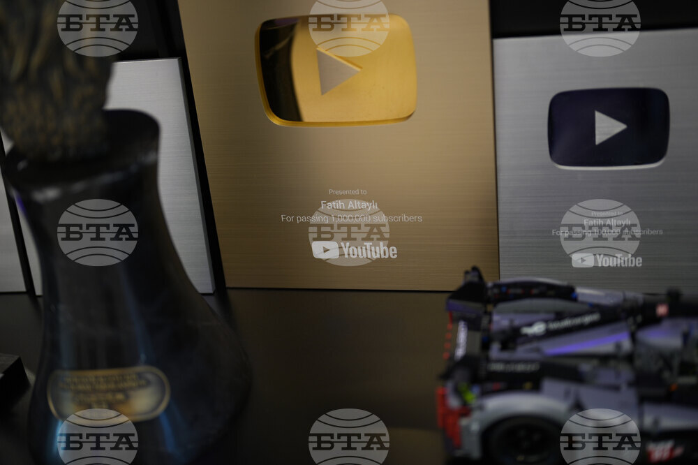 Plaques are displayed at the Teke Tek Medya news agency where imprisoned Turkish journalist Fatih Altayli continues to deliver comments on his YouTube show through letters read by his assistant, in Istanbul, Wednesday, Oct. 1, 2025. (AP Photo/Francisco Seco)