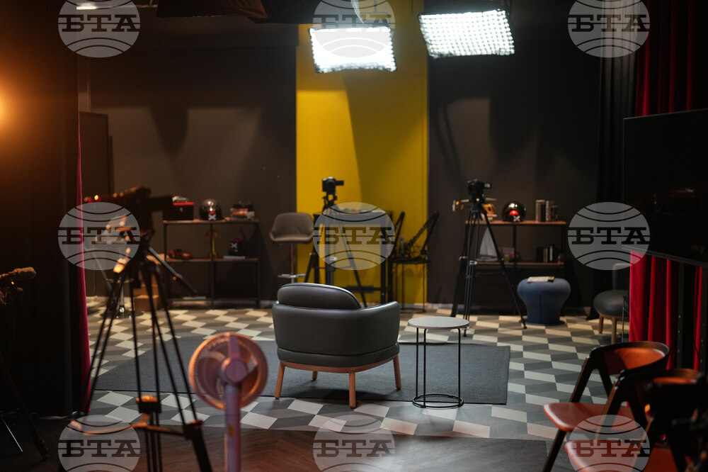 An empty chair takes center stage at a TV studio set where imprisoned Turkish journalist Fatih Altayli continues to deliver news on his YouTube show through letters read by his assistant, in Istanbul, Wednesday, Oct. 1, 2025. (AP Photo/Francisco Seco)