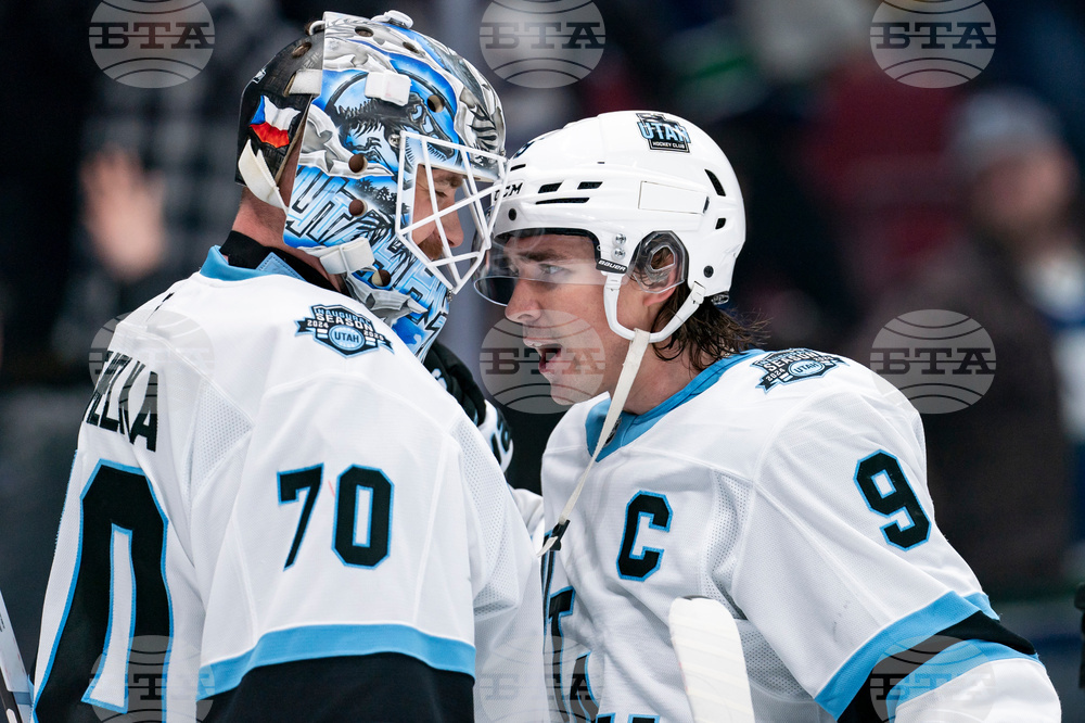 FILE - Utah Hockey Club goaltender Karel Vejmelka (70) and Clayton Keller (9) celebrate after defeating the Vancouver Canucks in an NHL hockey game in Vancouver, British Columbia, Sunday, March 16, 2025. (Ethan Cairns/The Canadian Press via AP, File)