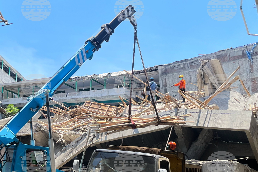 Rescuers deploy a crane to clear the rubble at the site where a building under construction collapsed Monday at an Islamic boarding school in Sidoarjo, East Java, Indonesia, Thursday, Oct. 2, 2025. (AP Photo/Trisnadi)