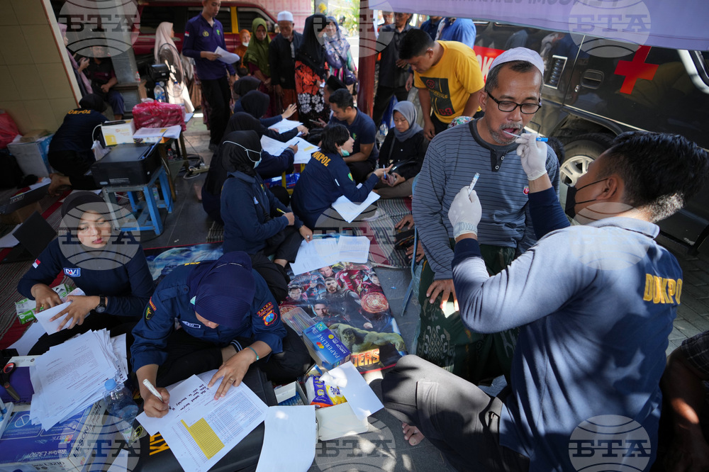 Members of police forensic unit collect DNA sample from students' family members after a building under construction collapsed Monday at an Islamic boarding school in Sidoarjo, East Java, Indonesia, Thursday, Oct. 2, 2025. (AP Photo/Achmad Ibrahim)