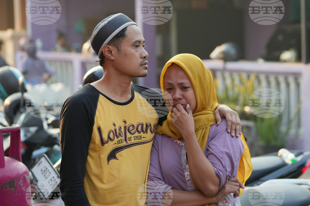 Family members of students weep as they wait while the search of victims is underway after a building collapsed at an Islamic boarding school in Sidoarjo, East Java, Indonesia, Friday, Oct. 3, 2025. (AP Photo/Achmad Ibrahim)