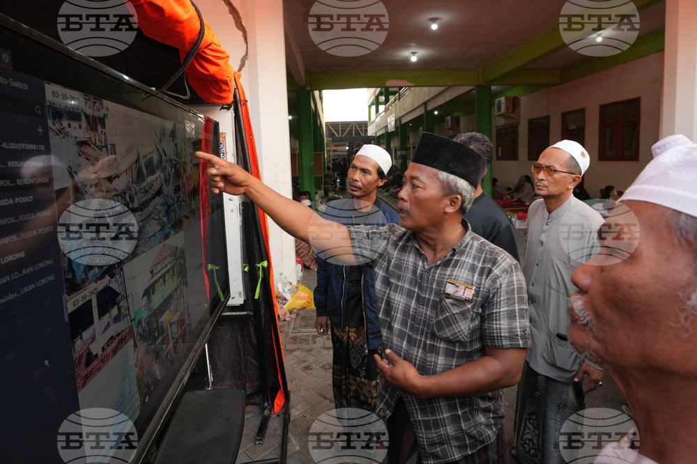 Men look at a screen displaying photos of a building that collapsed at an Islamic boarding school in Sidoarjo, East Java, Indonesia, Friday, Oct. 3, 2025. (AP Photo/Achmad Ibrahim)