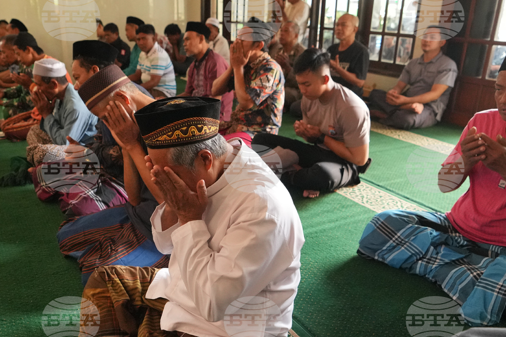 Muslim men attend a Friday prayer at a mosque near the site where a building collapsed at an Islamic boarding school in Sidoarjo, East Java, Indonesia, Friday, Oct. 3, 2025. (AP Photo/Achmad Ibrahim)