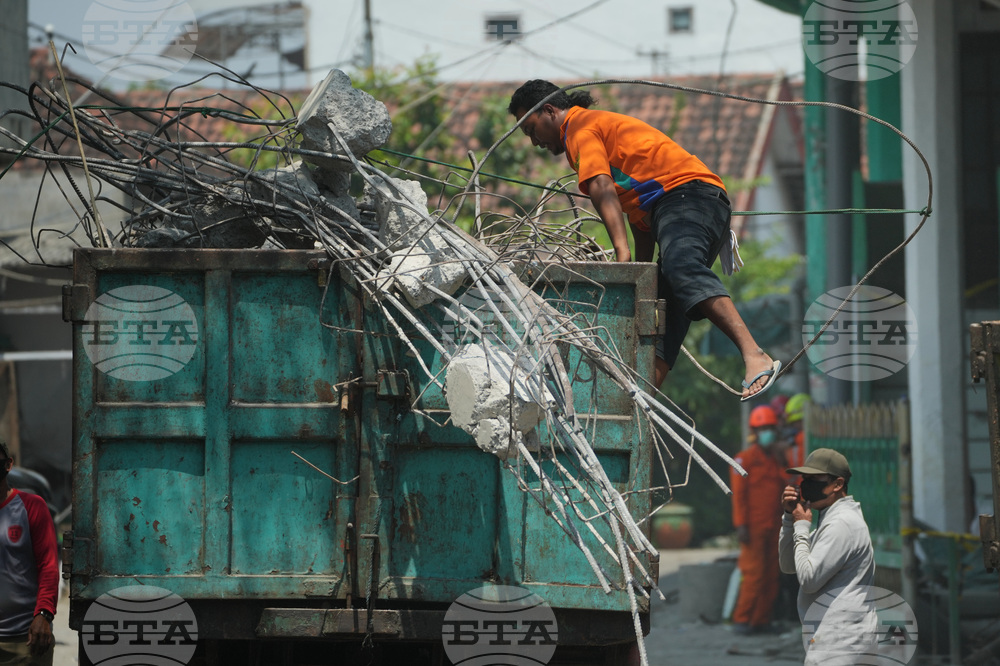 A worker climbs onto a truck loaded with debris cleared from the site where a building collapsed at an Islamic boarding school in Sidoarjo, East Java, Indonesia, Friday, Oct. 3, 2025. (AP Photo/Achmad Ibrahim)