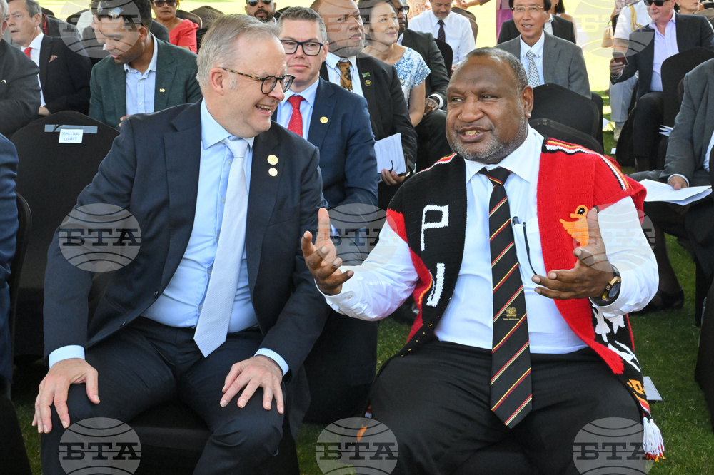 FILE - Australia's Prime Minister Anthony Albanese, left, and Papua New Guinea's Prime Minister James Marape attend a flag lowering ceremony in Port Moresby, Papua New Guinea, on Sept. 16, 2025. (Mick Tsikas/AAP Image via AP, File)