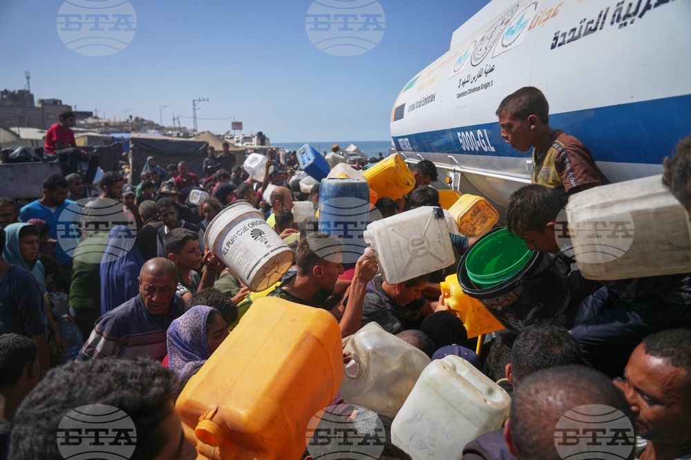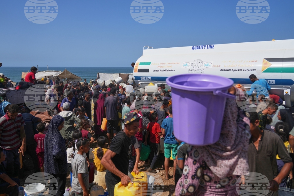 Displaced Palestinians gather to collect water from a truck at a makeshift camp in Nuseirat, central Gaza Strip, Thursday, Oct. 2, 2025.(AP Photo/Abdel Kareem Hana)