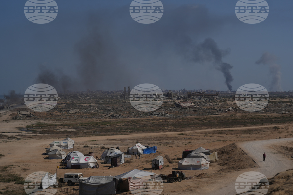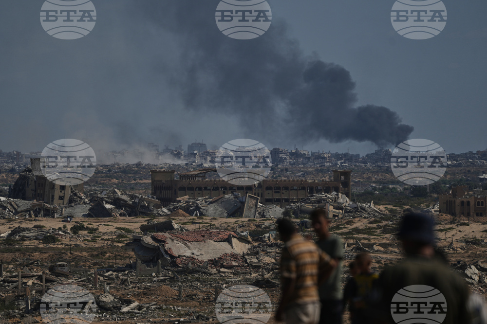Palestinians walk on an area next to a tent camp for displaced people as smokes rise to the sky following Israeli military strikes in Gaza City, as seen from the central Gaza Strip, Thursday, Oct. 2, 2025. (AP Photo/Abdel Kareem Hana)