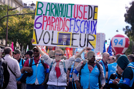A demonstrator displays a poster of luxury group LVMH CEO Bernard Arnault reading" B Arnault uses 6 tax havens , thief" during a new round of strikes and protests against the caretaker government and cost-cutting Thursday, Oct. 2, 2025 in Paris. (AP Photo/Michel Euler)