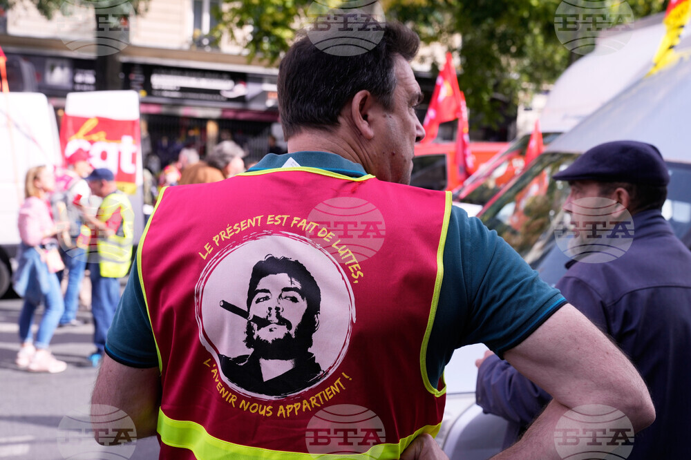 A demonstrator wears a shirt printed with a Che Guevara during a new round of strikes and protests against the caretaker government and cost-cutting Thursday, Oct. 2, 2025 in Paris. (AP Photo/Michel Euler)