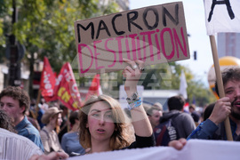 A demonstrator holds a poster reading "Macron, dismissal" during a new round of strikes and protests against the caretaker government and cost-cutting Thursday, Oct. 2, 2025 in Paris. (AP Photo/Michel Euler)