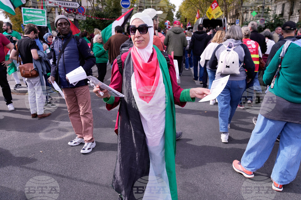 A woman wrapped in a Palestinian flag distributes leaflets during a demonstration Thursday, Oct. 2, 2025 in Paris. (AP Photo/Michel Euler)