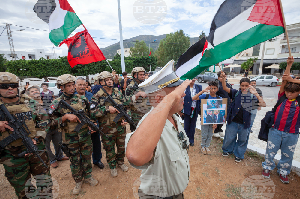 Demonstrators gather at a memorial site honoring the victims of the 1985 Israeli attack on Palestine Liberation Organization's headquarters, in Hammam Chott outside Tunisia's capital, Tunisia, Wednesday, Oct. 1, 2025. (AP Photo/Ons Abid)
