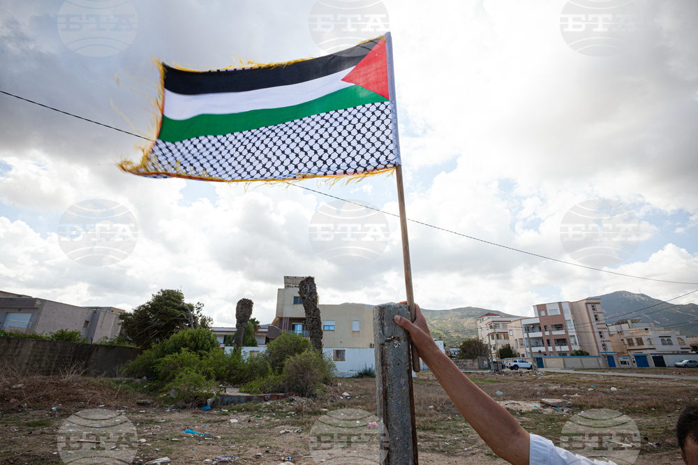 Demonstrators gather at a former PLO headquarters and prison which was targeted by Israel in 1985, in Hammam Chott outside Tunisia's capital, Tunisia, Wednesday, Oct. 1, 2025. (AP Photo/Ons Abid)