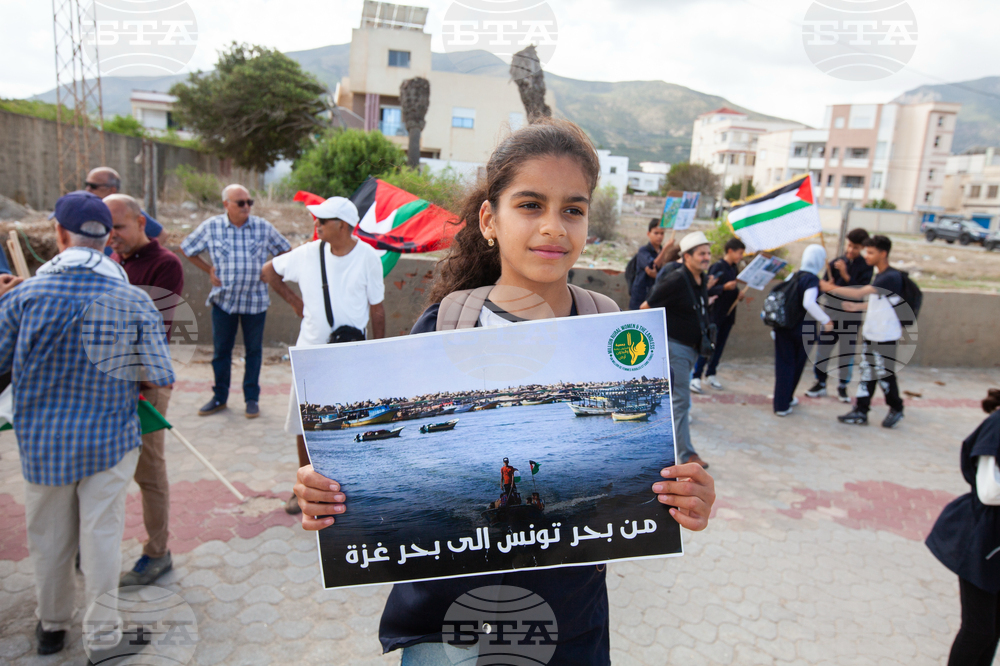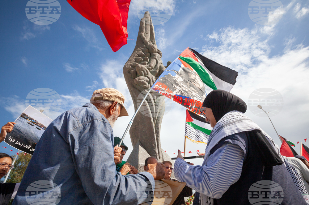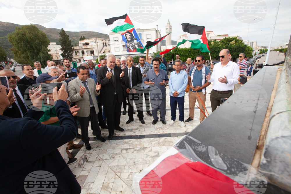 Demonstrators gather at a memorial site honoring the victims of the 1985 Israeli attack on Palestine Liberation Organization's headquarters, in Hammam Chott outside Tunisia's capital, Wednesday, Oct. 1, 2025. Banner in Arabic reads "From the sea of Tunisia to the sea of Gaza". (AP Photo/Ons Abid)