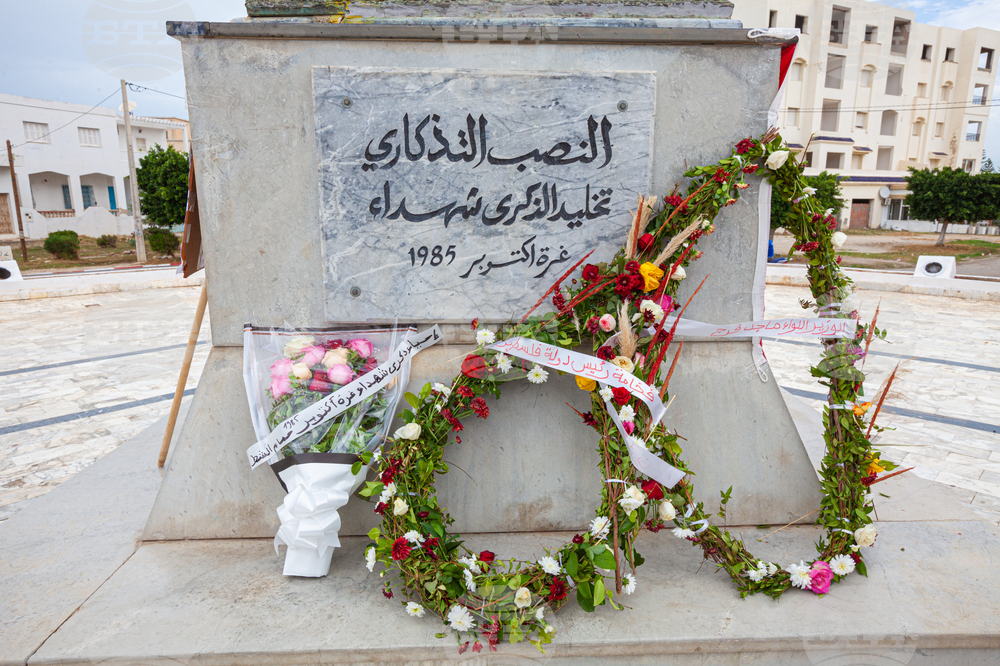 Demonstrators gather at a memorial site honoring the victims of the 1985 Israeli attack on Palestine Liberation Organization's headquarters, in Hammam Chott outside Tunisia's capital, Wednesday, Oct. 1, 2025. (AP Photo/Ons Abid)
