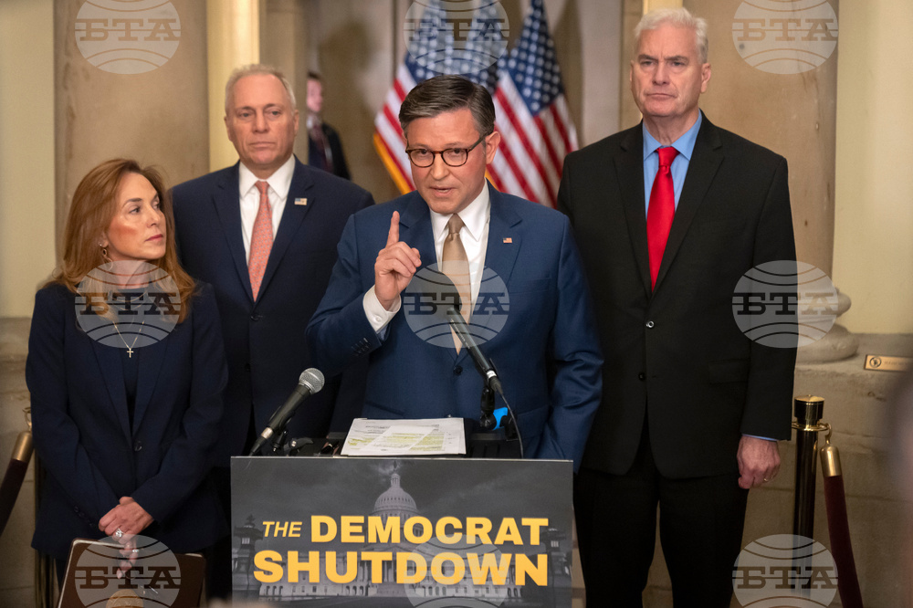 House Speaker Mike Johnson R-La., speaks as, from left, House Republican Caucus Chair Rep. Lisa McClain, R-Mich., House Majority Leader Rep. Steve Scalise, R-La., and House Majority Whip Rep. Tom Emmer, R-Minn., listen during a press conference at Johnson's office in the Capitol, Thursday, Oct. 2, 2025, in Washington. (AP Photo/Mark Schiefelbein)