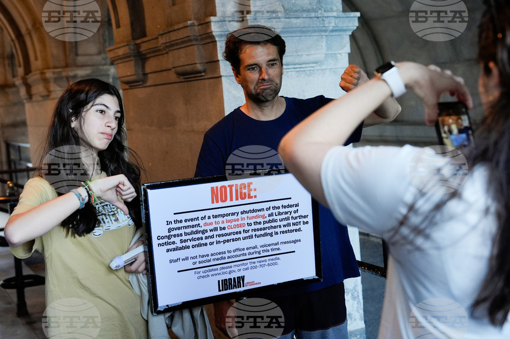 People take photos with a sign announcing that the Library of Congress is closed, on the first day of a partial government shutdown, Wednesday, Oct. 1, 2025, in Washington. (AP Photo/Julia Demaree Nikhinson)