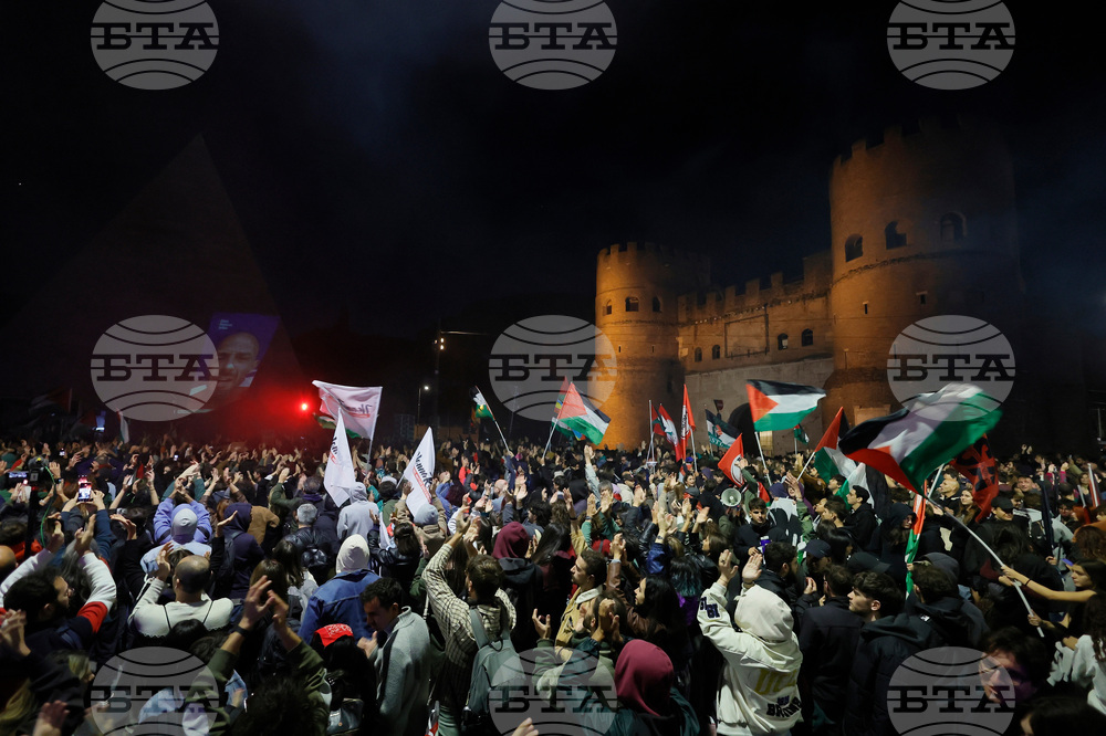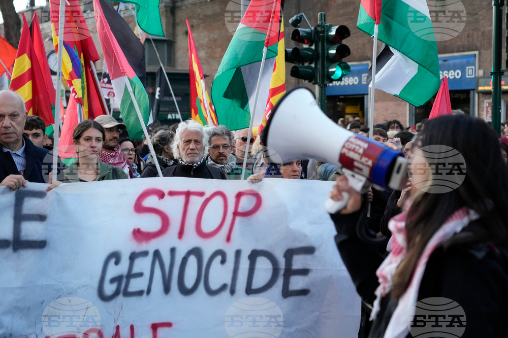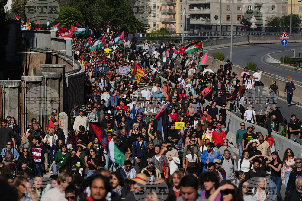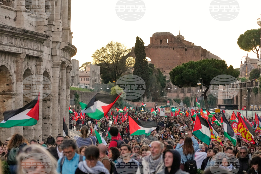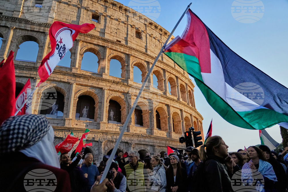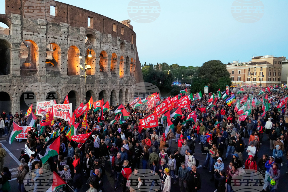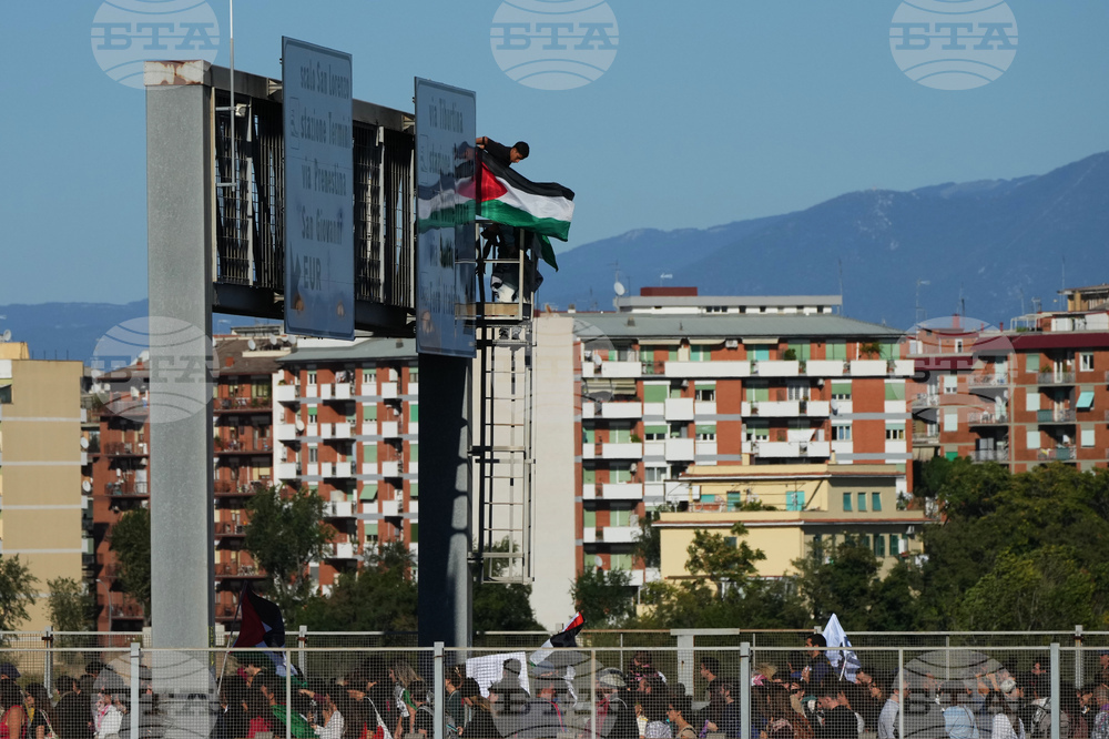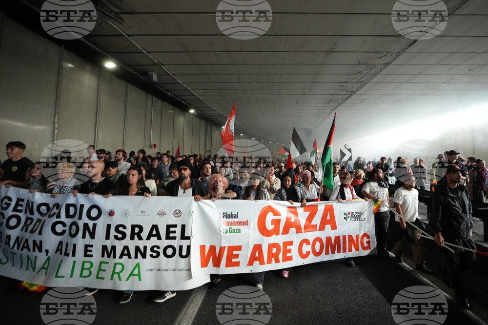 Pro-Palestinian demonstrators attend a rally in Rome, Italy, Oct. 2, 2025, in solidarity with the Global Sumud Flotilla after ships were intercepted by the Israeli navy. (Cecilia Fabiano/LaPresse via AP)