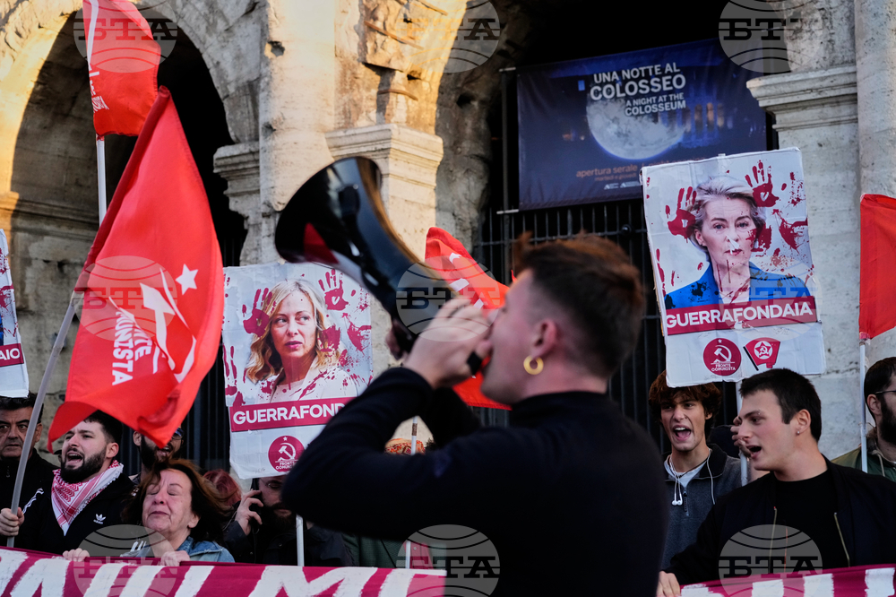 Pro-Palestinian demonstrators with placards depicting Italian Premier Giorgia Meloni, left, and President of the European Commission Ursula von der Leyen with scrips in Italian reading "Warmonger", gather in front of the Colosseum in Rome, Thursday, Oct. 2, 2025, to protest after a Gaza-bound aid flotilla was intercepted by Israeli Defense Forces in the Mediterranean Sea on Wednesday. (AP Photo/Gregorio Borgia)