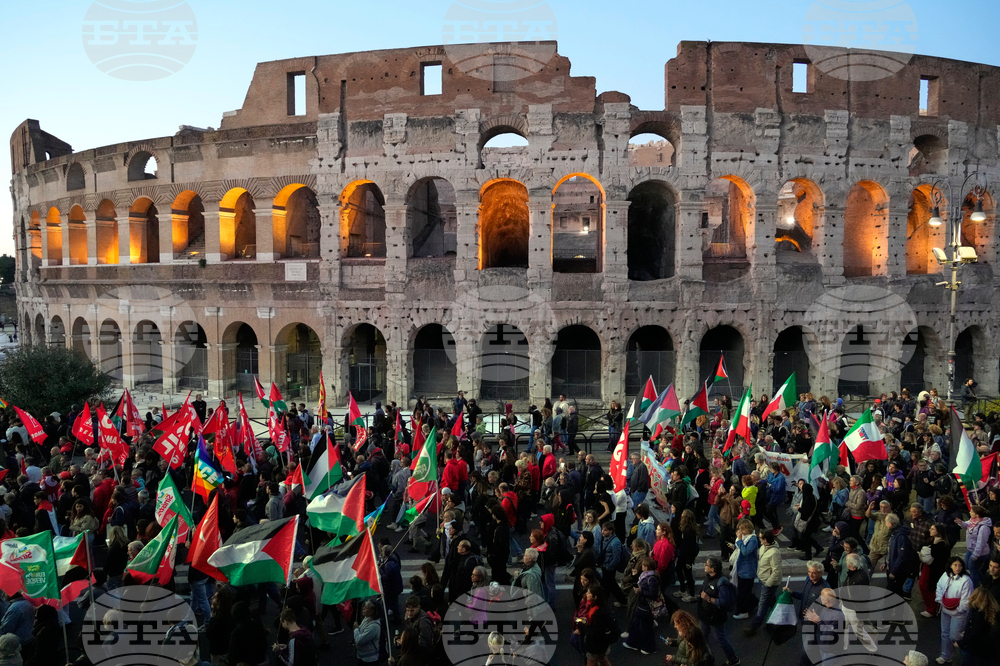Pro-Palestinian demonstrators gather in front of the Colosseum in Rome, Thursday, Oct. 2, 2025, to protest after a Gaza-bound aid flotilla was intercepted by Israeli Defense Forces in the Mediterranean Sea on Wednesday. (AP Photo/Gregorio Borgia)