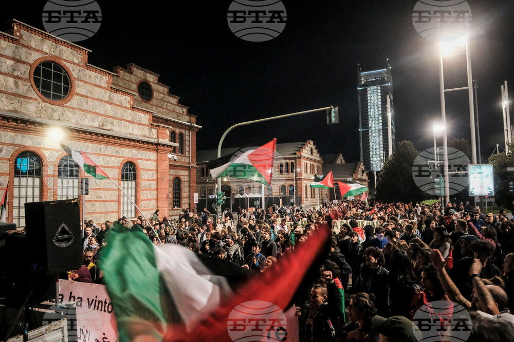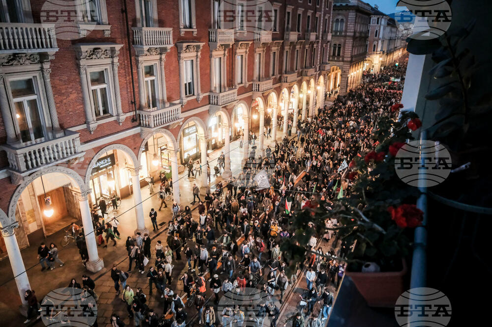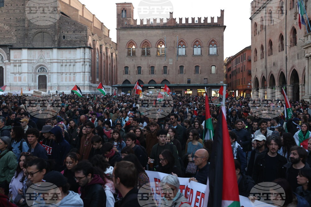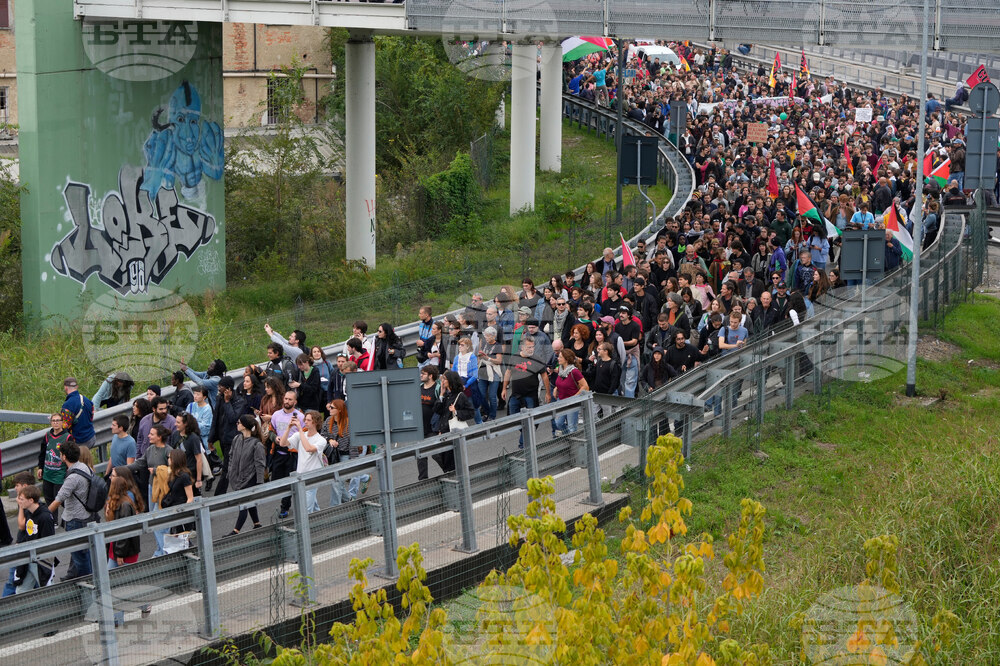 Protesters rally during protests, Thursday, Oct. 2, 2025, in Bologna, Italy, after a Global Sumud Flotilla carrying aid to Gaza was intercepted by Israel. (Guido Calamosca/LaPresse via AP)