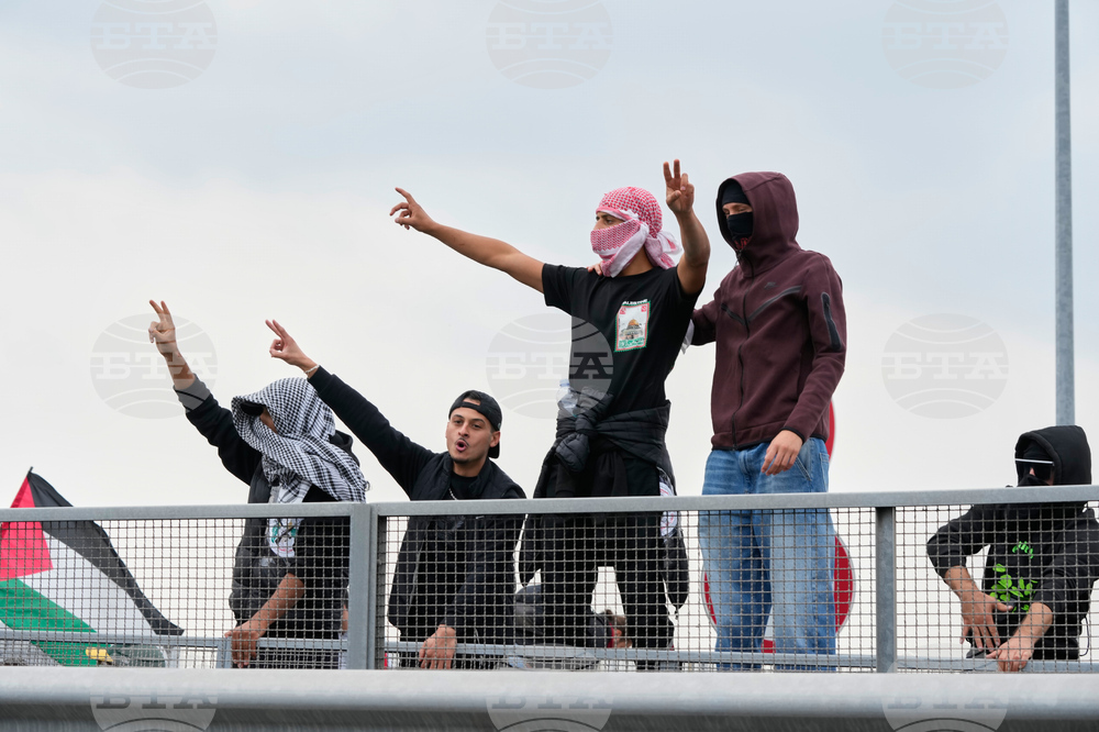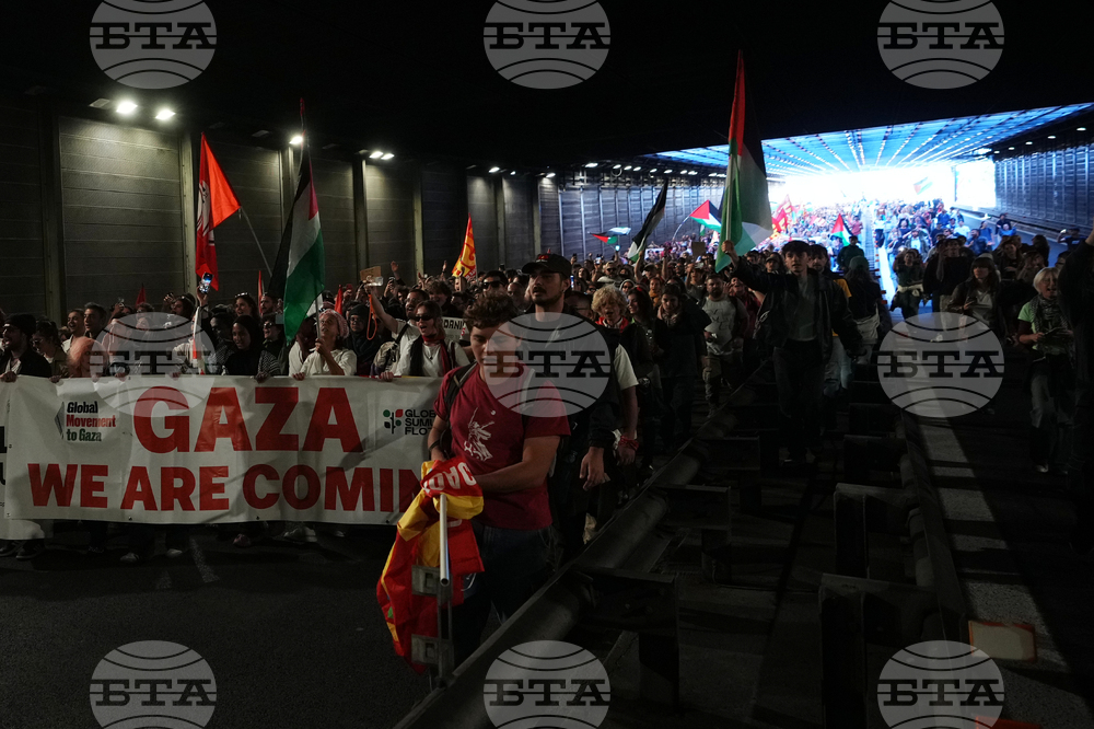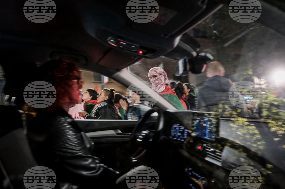 A person drives a car as pro-Palestinian demonstrators attend a rally in Turin, Italy, Oct. 2, 2025, in solidarity with the Global Sumud Flotilla after ships were intercepted by the Israeli navy. (Giulio Lapone/LaPresse via AP)