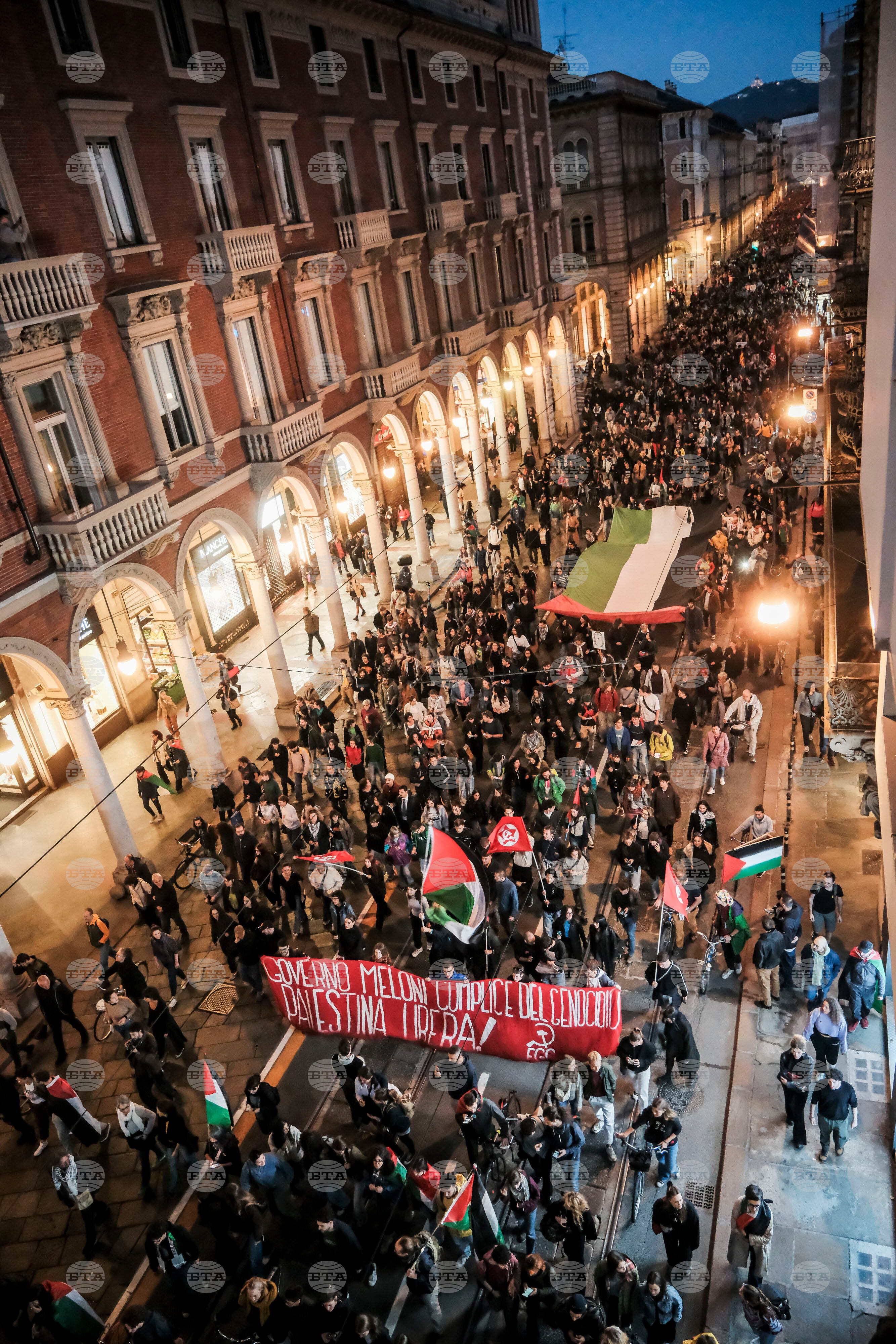 Pro-Palestinian demonstrators gather in Milan, Thursday, Oct. 2, 2025, to protest after a Gaza-bound aid flotilla was intercepted by Israeli Defense Forces in the Mediterranean Sea on Wednesday. (AP Photo/Antonio Calanni)