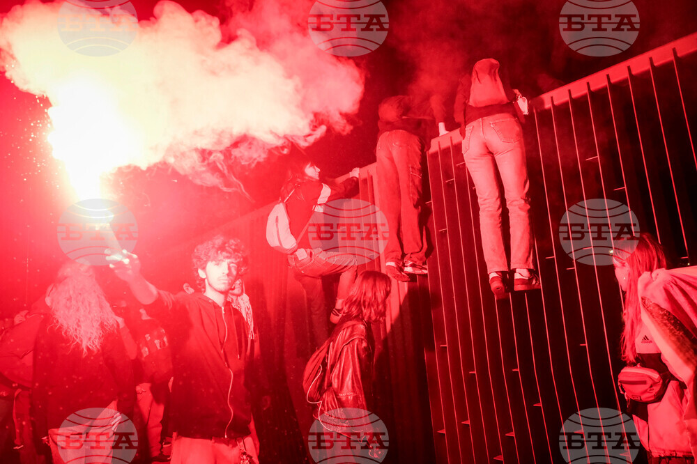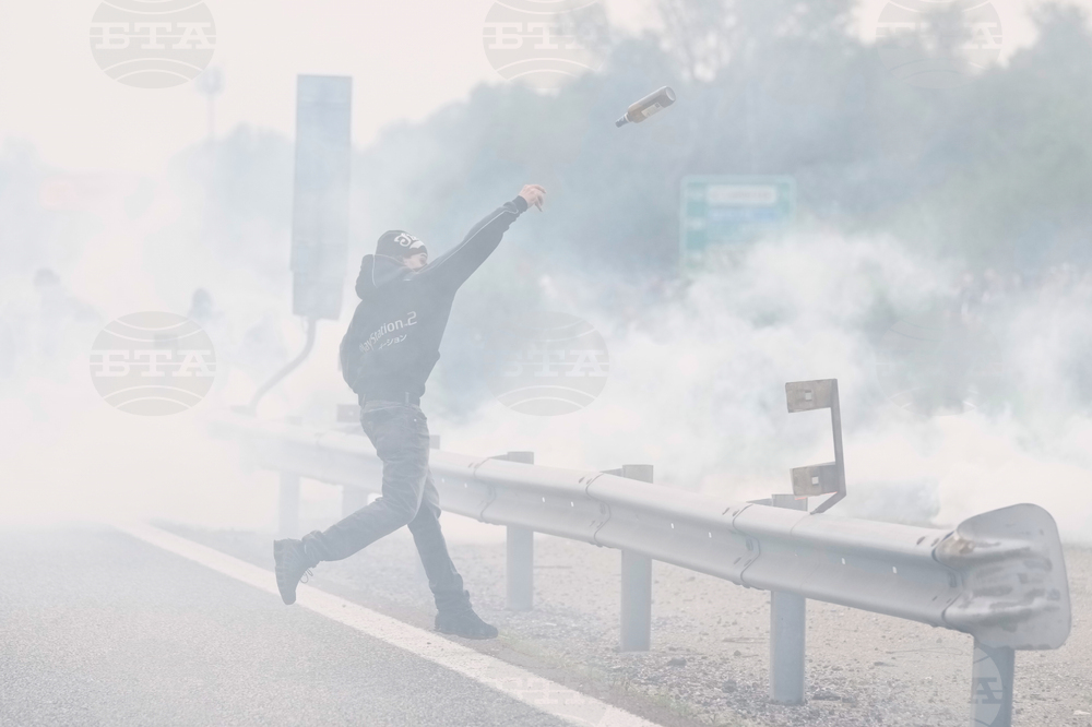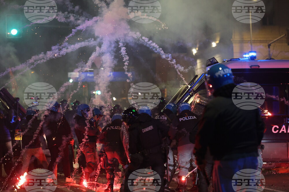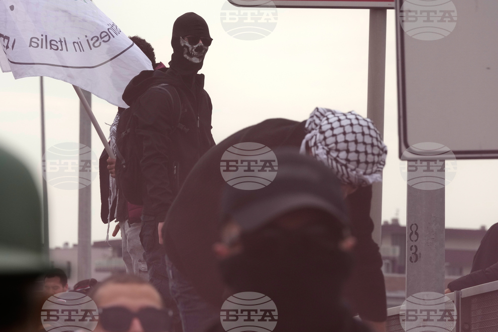 Protesters clash with police during protests, Thursday, Oct. 2, 2025, in Bologna, Italy, after a Global Sumud Flotilla carrying aid to Gaza was intercepted by Israel. (Guido Calamosca/LaPresse via AP)