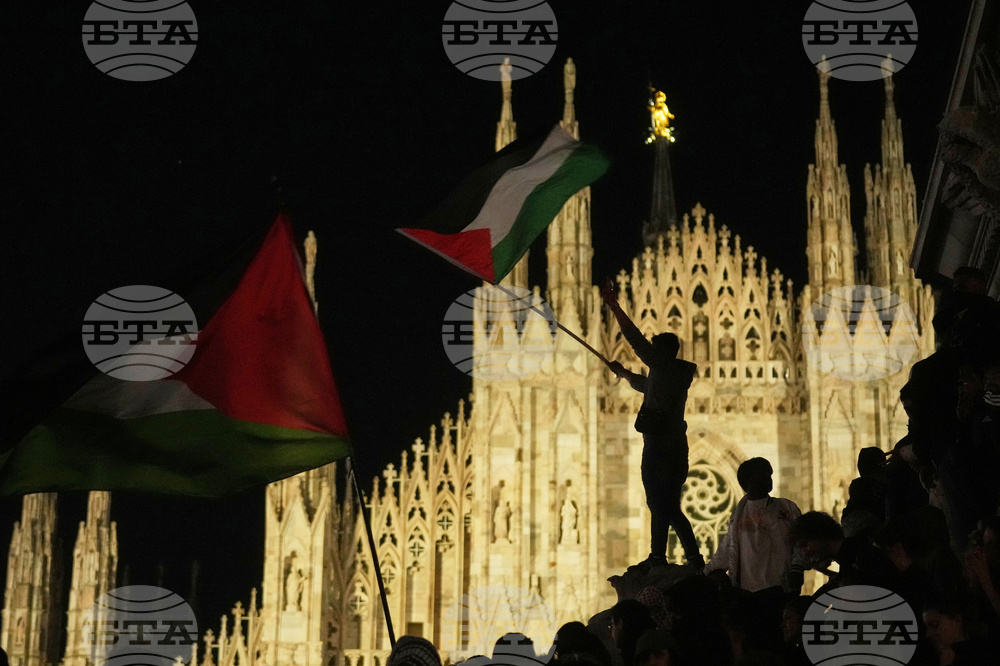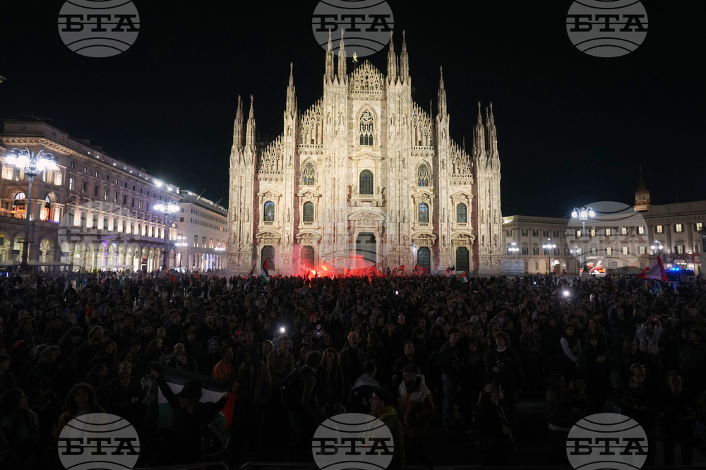 Pro-Palestinian demonstrators gather in front of the Milan's Duomo gothic cathedral, Italy, Thursday, Oct. 2, 2025, to protest after a Gaza-bound aid flotilla was intercepted by Israeli Defense Forces in the Mediterranean Sea on Wednesday. (AP Photo/Antonio Calanni)