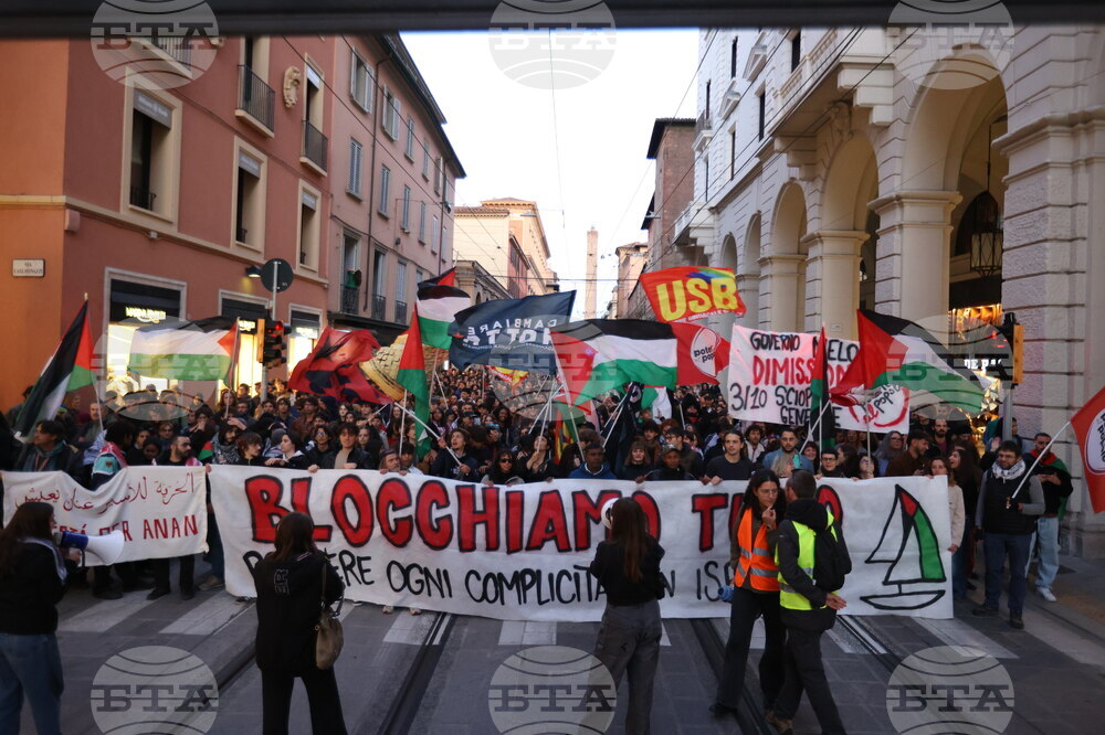Demonstrators march in support of the Global Sumud Flotilla and Gaza, in Bologna, Italy, Wednesday, Oct. 1, 2025. (Guido Calamosca/LaPresse via AP)