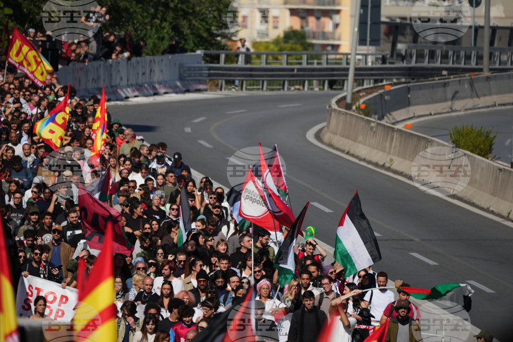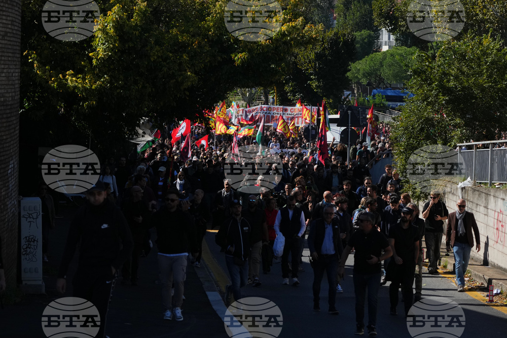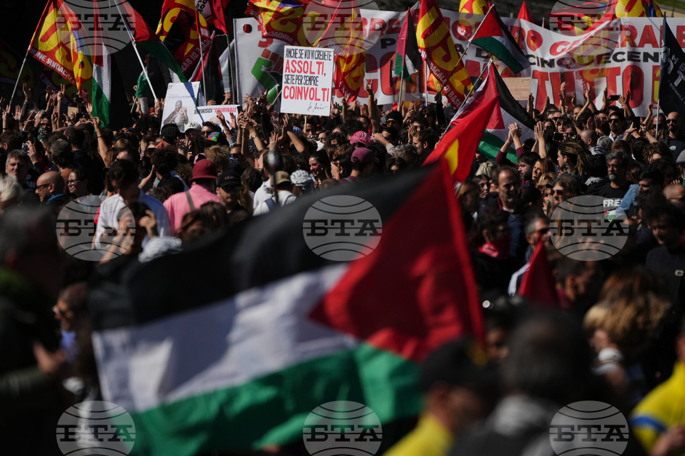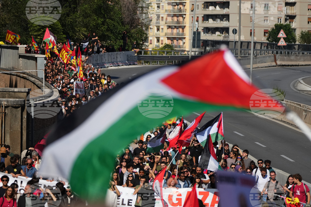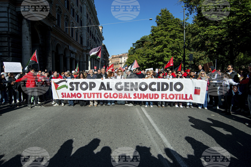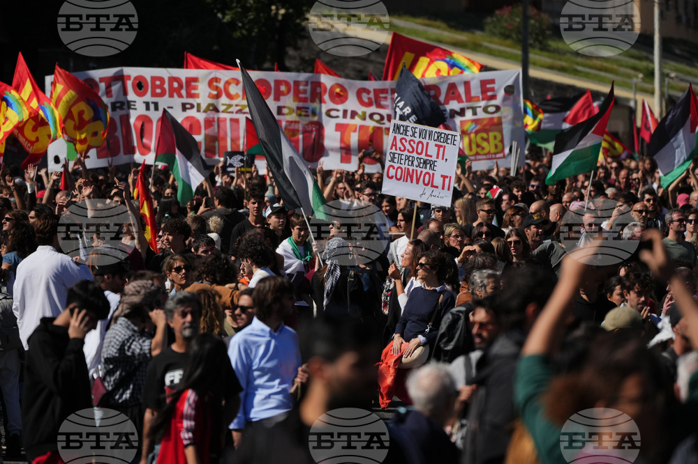 Pro-Palestinian demonstrators gather for a national general strike called by different unions to protest against the situation in Gaza two days after Israeli forces intercepted a Gaza-bound aid flotilla in the Mediterranean Sea, in Rome, Friday, Oct. 3, 2025. (AP Photo/Alessandra Tarantino)