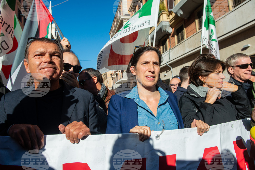 Leader of the Democratic Party Elly Schlein, center, participates in a march on the occasion of a general strike in support of Gaza, in Rome, Friday, Oct. 3, 2025 (Valentina Stefanelli/LaPresse via AP)