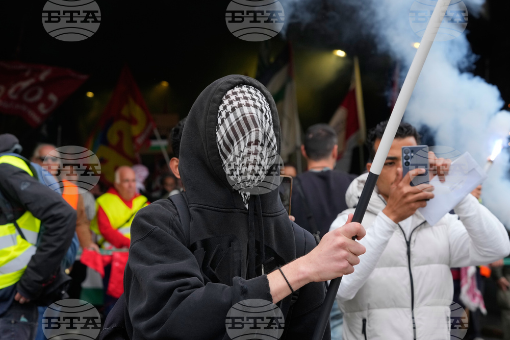 Demonstrators march on the occasion of a general strike in solidarity with the Palestinian people and the flotilla, in Milan, Italy, Friday, Oct. 3 2025. (Stefano Porta/LaPresse via AP)