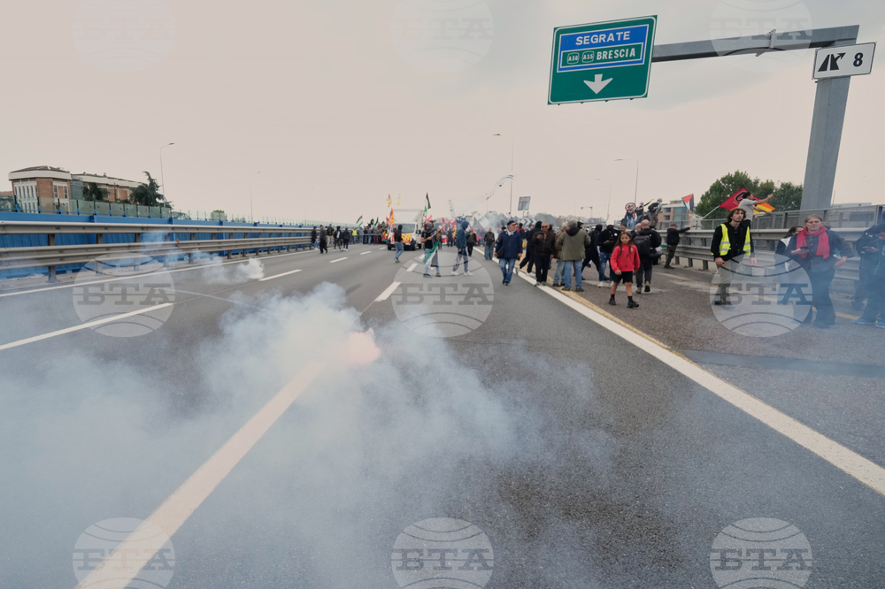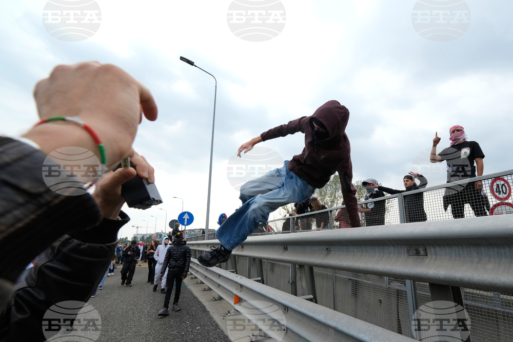 Pro-Palestinian demonstrators march along the Milan's ring road as they run against Police during a national general strike called by different unions to protest against the situation in Gaza two days after Israeli forces intercepted a Gaza-bound aid flotilla in the Mediterranean Sea, in Milan, Italy, Friday, Oct. 3, 2025. (AP Photo/Luca Bruno)