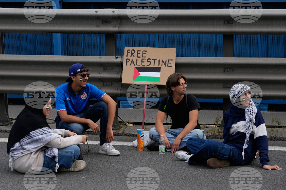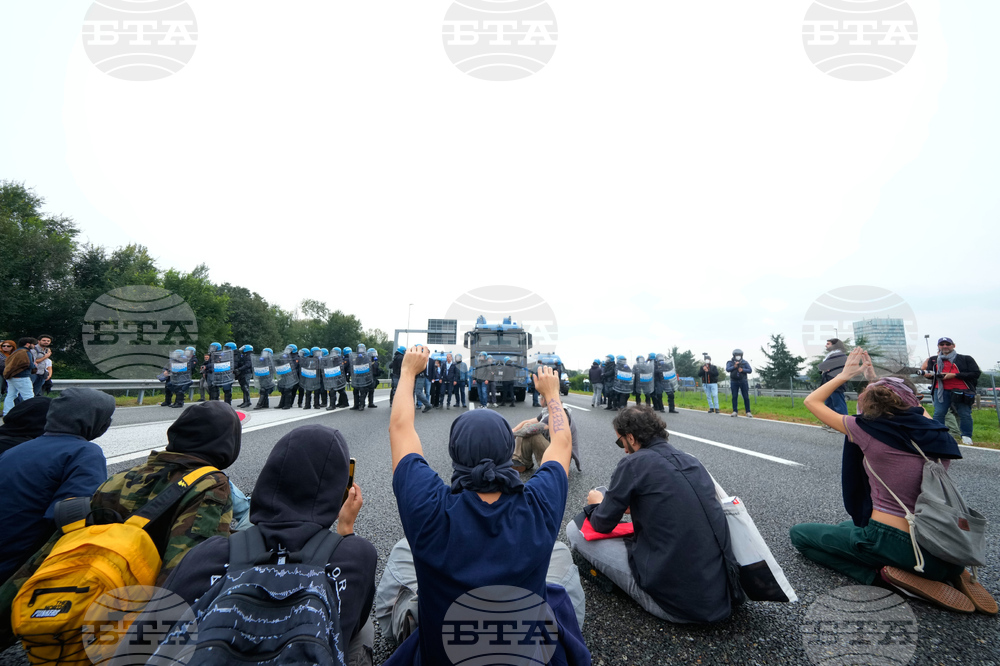 Pro-Palestinian demonstrators sits on the on the Milan's ring road during a protest part of a national general strike called by different unions to protest against the situation in Gaza two days after Israeli forces intercepted a Gaza-bound aid flotilla in the Mediterranean Sea, in Milan, Italy, Friday, Oct. 3, 2025. (AP Photo/Luca Bruno)
