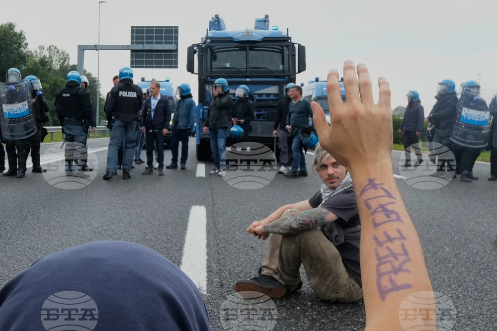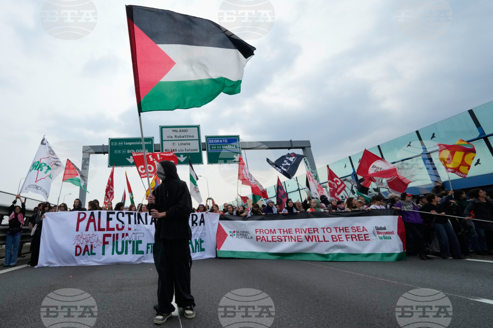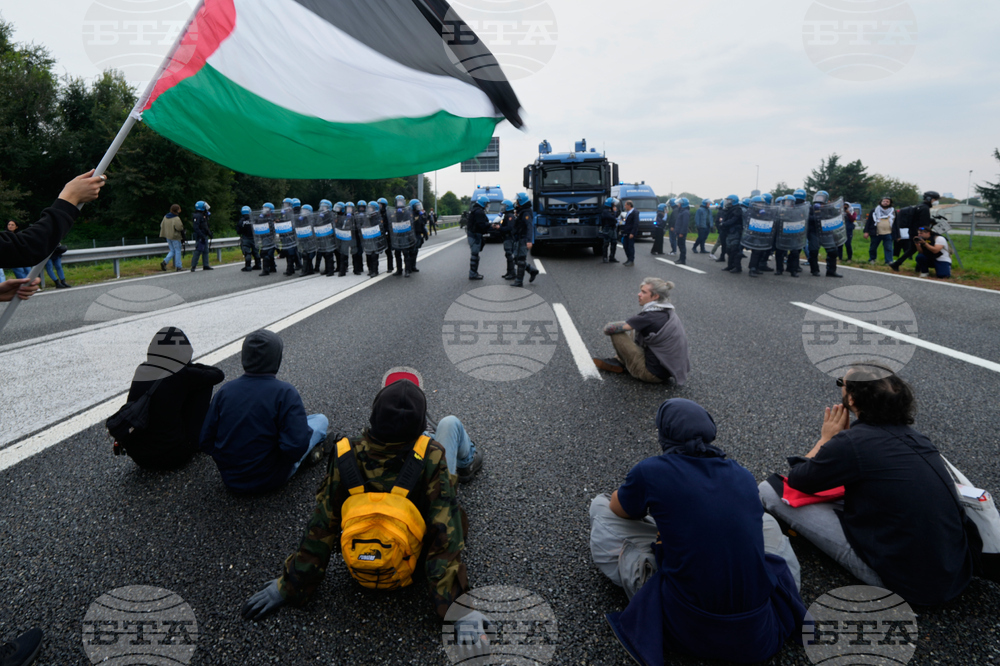 Pro-Palestinian demonstrators sits on the Milan's ring road during a protest part of a national general strike called by different unions to protest against the situation in Gaza two days after Israeli forces intercepted a Gaza-bound aid flotilla in the Mediterranean Sea, in Milan, Italy, Friday, Oct. 3, 2025. (AP Photo/Luca Bruno)
