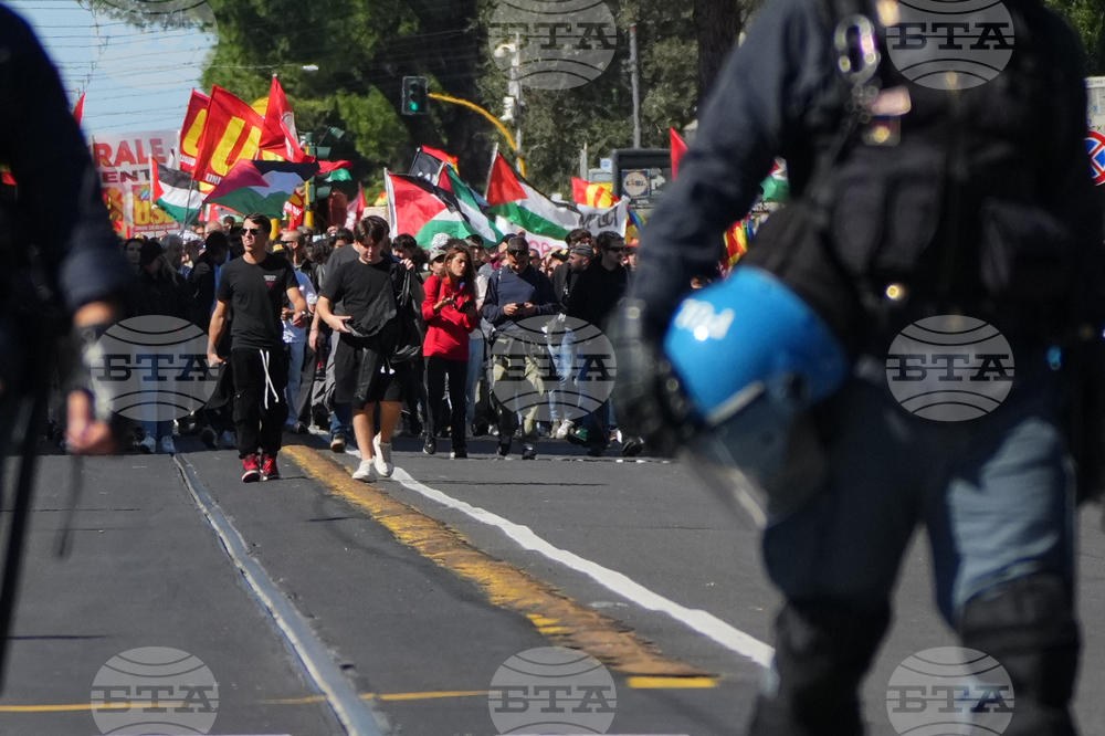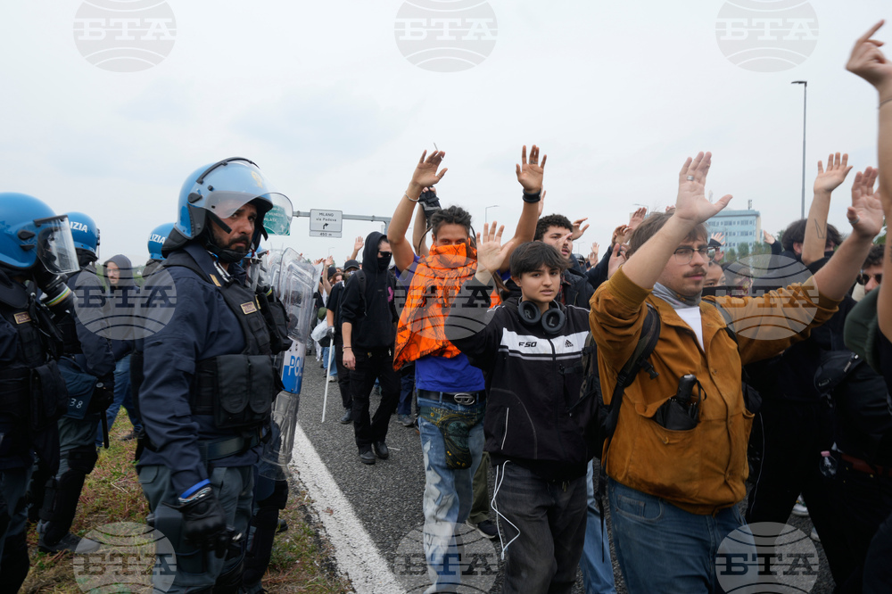 Carabinieri police officers stand during pro-Palestinian protest for a national general strike called by different unions to protest against the situation in Gaza two days after Israeli forces intercepted a Gaza-bound aid flotilla in the Mediterranean Sea, in Milan, Italy, Friday, Oct. 3, 2025. (AP Photo/Luca Bruno)