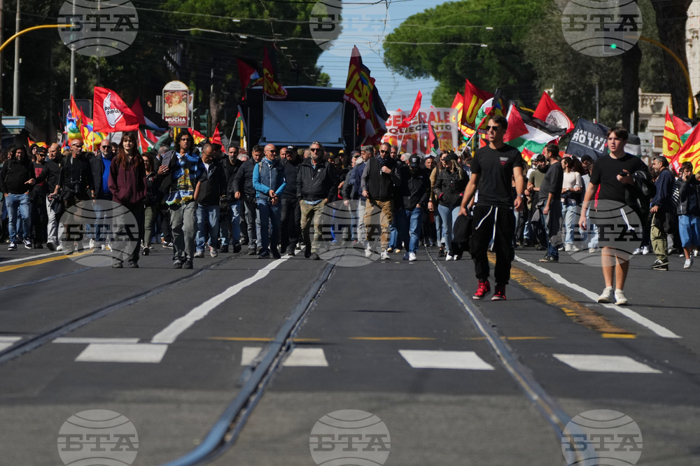 Demonstrators march during general strike in solidarity with the Palestinian people and the flotilla, outside Termini train station in Rome, Friday Oct. 3, 2025. (Cecilia Fabiano/LaPresse via AP)