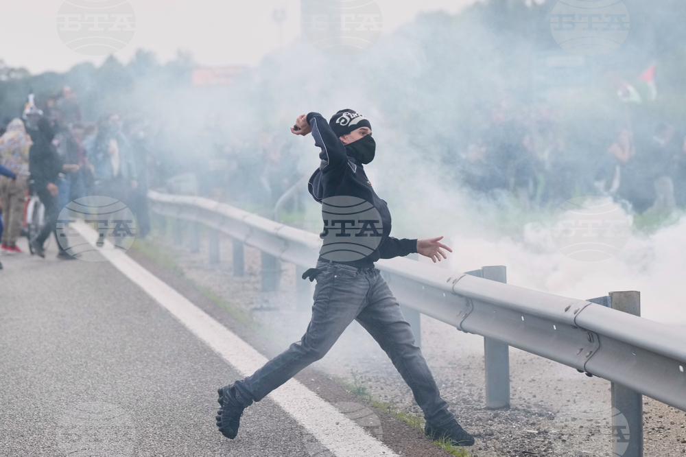 A pro-Palestinian demonstrator throws rocks during a demonstration part of a national general strike called by different unions to protest against the situation in Gaza two days after Israeli forces intercepted a Gaza-bound aid flotilla in the Mediterranean Sea, in Milan, Italy, Friday, Oct. 3, 2025. (AP Photo/Luca Bruno)
