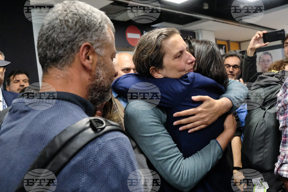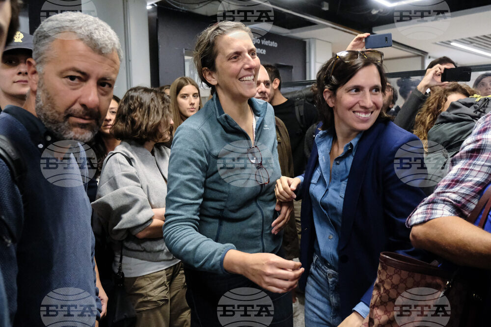 Italian Democratic party leader Elly Schlein, right, welcomes members of Italian Parliament Arturo Scotto, left, and Annalisa Corrado upon their landing at the Rome Leonardo da Vinci airport after being released by Israeli authorities following their detention for being aboard boats of the Global Sumud Flottila. (Mauro Scrobogna/LaPresse via AP)