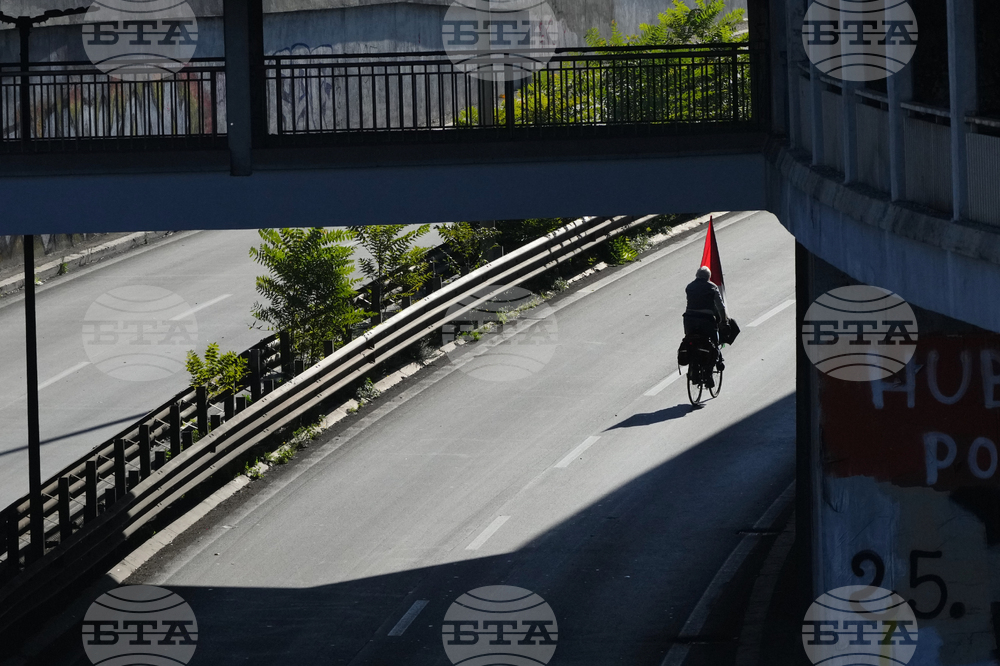 A pro-Palestinian demonstrator rides his bicycle along the Rome's ring road as he gathers for a national general strike called by different unions to protest against the situation in Gaza two days after Israeli forces intercepted a Gaza-bound aid flotilla in the Mediterranean Sea, in Rome, Friday, Oct. 3, 2025. (AP Photo/Alessandra Tarantino)