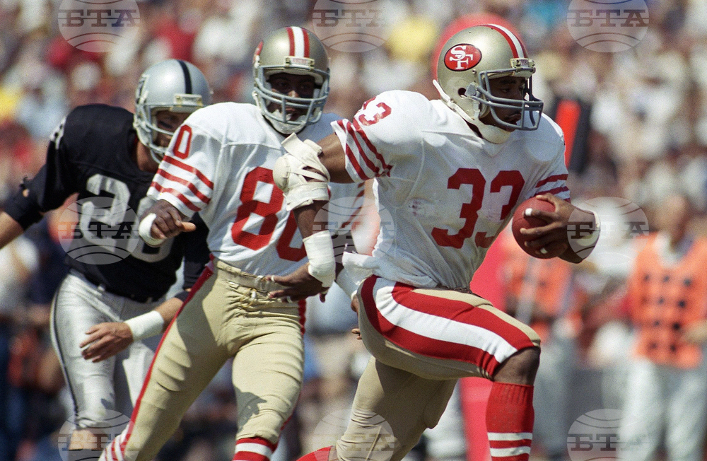 FILE - San Francisco 49ers Roger Craig (33) heads for the end zone and first quarter touchdown during an NFL football game against the Los Angeles Raiders at the Coliseum in Los Angeles, Sunday, Sept. 22, 1985. (AP Photo/Doug Pizac, File)