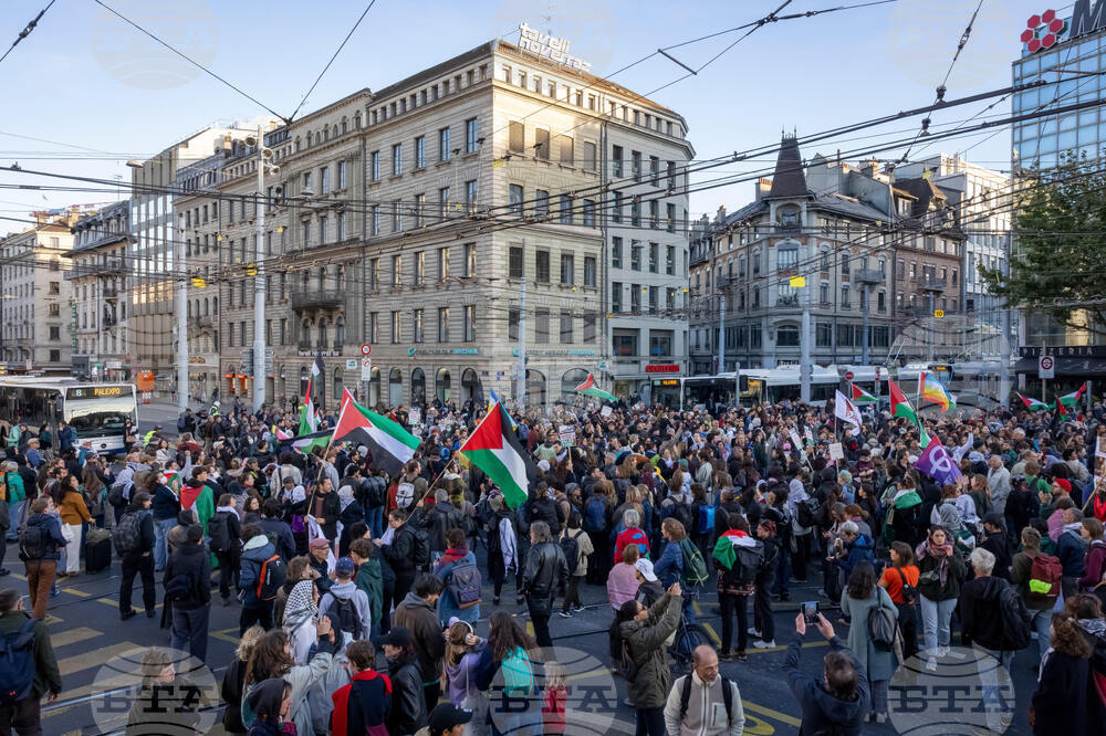 People attend a protest in Geneva, Switzerland, on Thursday, October 2, 2025, in solidarity with the Global Sumud Flotilla after ships were intercepted by the Israeli navy. (Magali Girardin/Keystone via AP)